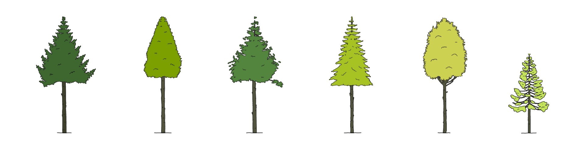 To bring the new and complex forestry method to life, we first had to dig deep into its core principles to understand. Many meetings and excursions into the forest helped us grasp the concept and also served as great inspiration for our visual creation, for example, the six different tree species shown below.